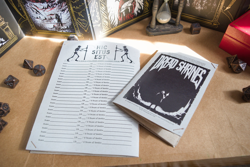 DREAD SHRINES is a solo journaling, pen-and-paper, roguelike dungeon crawler inspired by games like Pelle Nilsson's DARK FORT, FromSoft's Dark Souls, ChAIR Entertainment's Infinity Blade, among others.